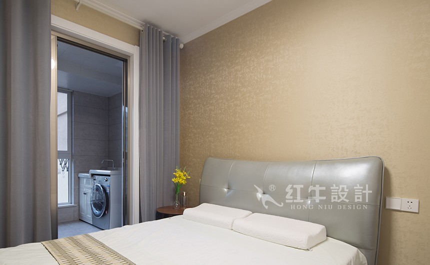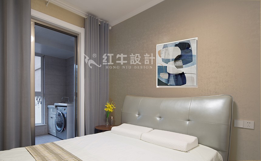 墻面色調莊重而不失雅致,給人以沉穩(wěn)、懷舊的感覺。同時選用了灰色的窗簾,白色的床品與之搭配,整體環(huán)境充滿了和諧與美感。