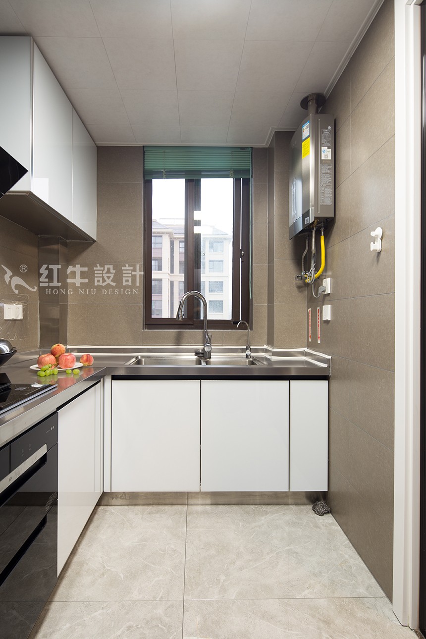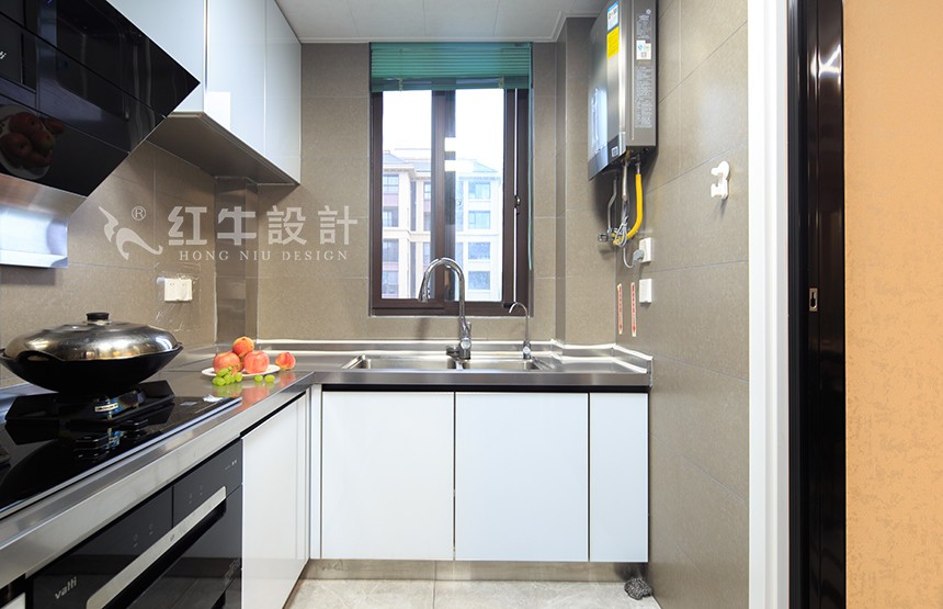 黑色和白色帶來醒目的對比,搭配灰色墻面展現出現代感。吊柜擁有強勁的收納功能,油煙機嵌在吊柜里面,顯得整潔美觀。廚房安裝了雙水槽,可以分類清洗,使用起來很方便。