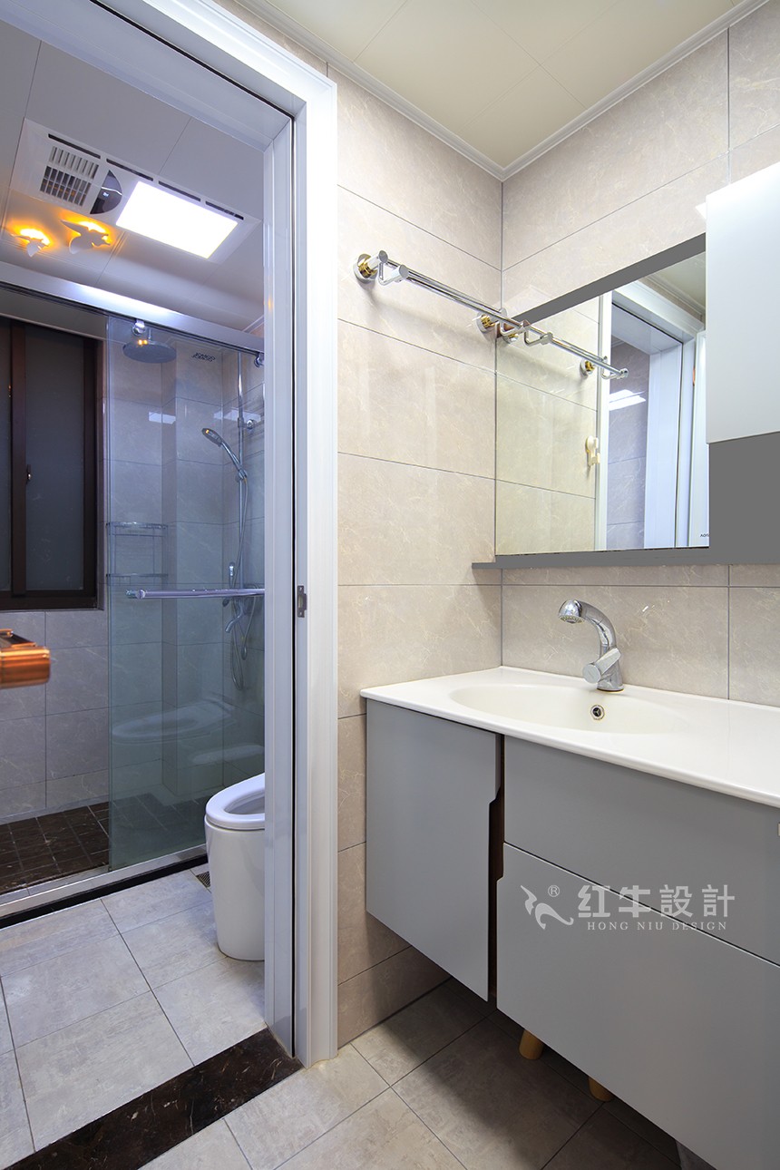 洗手臺被分離在外,提高了衛(wèi)生間的使用效率。柜子能夠收納零散物品,使之外表清爽整潔。玻璃推拉門隔斷淋浴區(qū),做到干濕分離,保持沐浴之外的場地干燥衛(wèi)生。