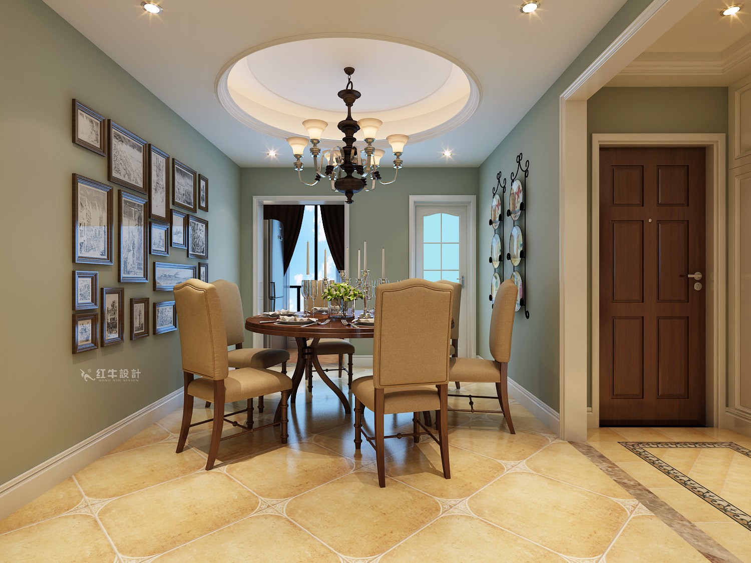 在餐桌的旁邊擺放一些裝飾畫,以達(dá)到增加餐廳的情調(diào)。 餐廳依舊選用灰綠色壁紙來搭,以此提亮整個空間,帶來一些清亮之感;這樣搭配會更顯精致、美觀。再看餐廳墻面裝飾溫馨而不失大氣,實木餐桌椅可供六人用餐,擺放在餐廳的正中央;從形狀上看,圓形餐桌與頂面圓形吊頂造型相互呼應(yīng),看起來非常和諧。