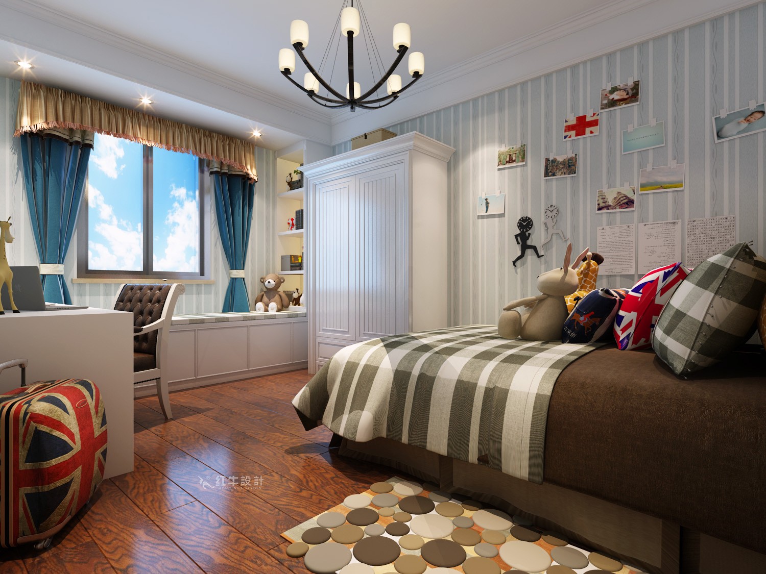 兒童房設(shè)計十分活潑,床頭墻紙和地面地毯帶有各種各樣的玩偶,令睡房無比靈動,給孩子帶來了一個歡樂世界。為符合這種韻味,窗簾特意選擇了普藍(lán)色,來增添趣味。根據(jù)戶型,在窗戶下設(shè)計卡座是非常合適的,左右兩邊是兩扇柜門衣柜,可收納孩子一年四季的衣物;整體上看很是完整,而且使用功能非常強大。