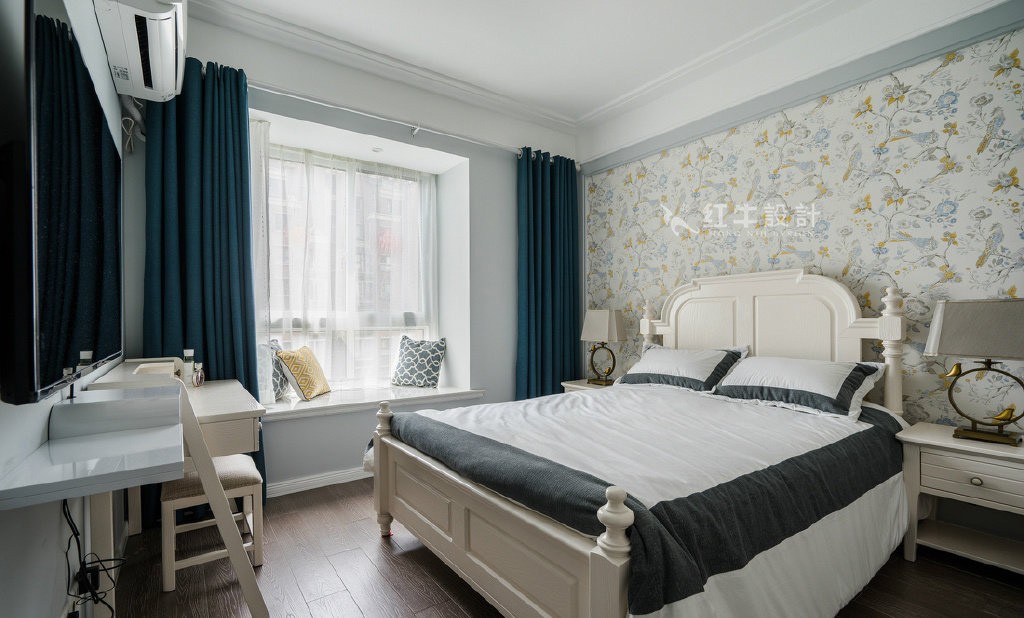 背景墻上的花鳥圖案清新又有情調(diào),臺(tái)燈圓環(huán)上裝飾的金屬小鳥精致美觀,臥室整體的協(xié)調(diào)帶給人舒適的視覺體驗(yàn)。