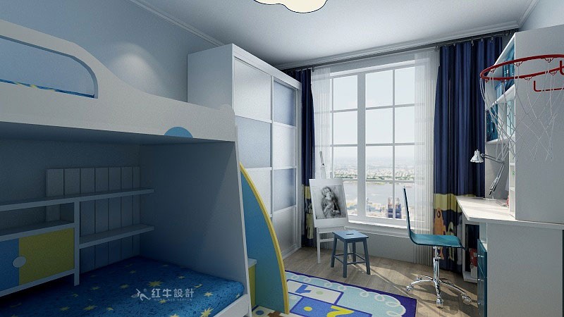 整個空間以藍色為基調(diào)打底,淺灰色復合地板,墻面用簡單的線條勾勒出整個空間的格調(diào),清新淡雅。