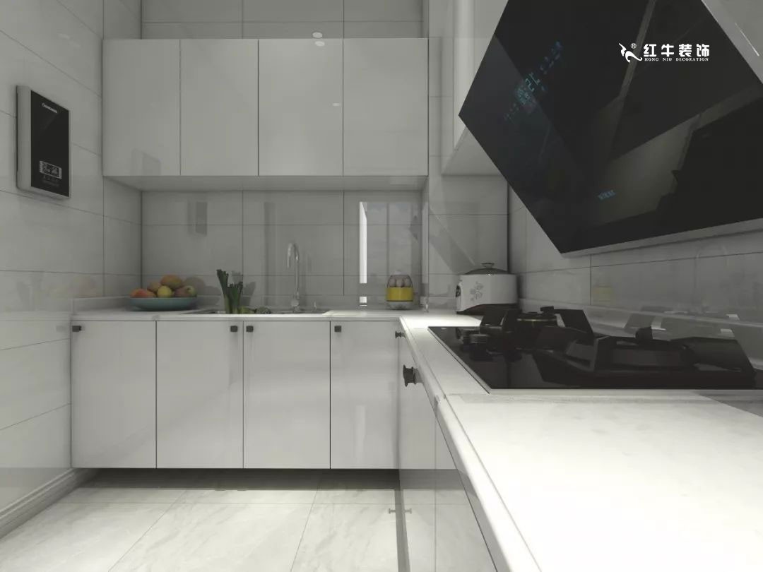 相對(duì)狹長(zhǎng)的廚房,設(shè)計(jì)成L型非常合適,能夠?qū)⑾床藚^(qū)和烹飪區(qū)分開。白色給人一種純凈的感覺,讓空間顯得寬敞通透不少。