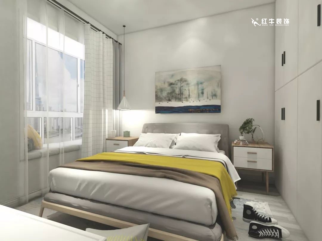 灰色木地板,淺色墻面,清新素雅的裝飾畫,充滿質(zhì)感的床頭吊燈,白紗窗簾后面隱藏的飄窗,呈現(xiàn)出精致舒適的休息空間。