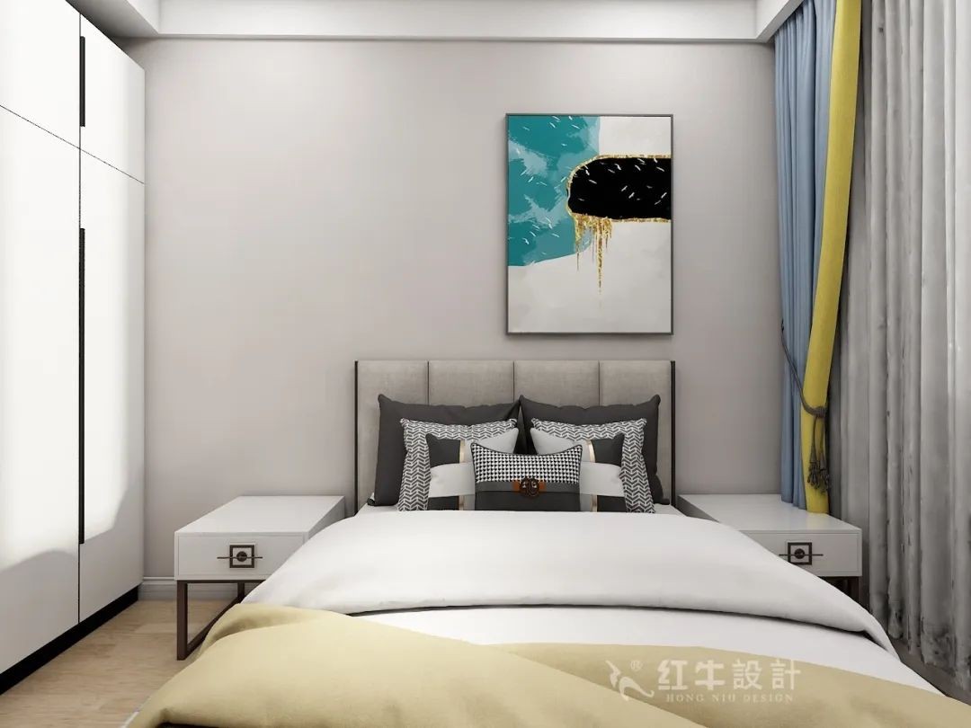 主臥大面積用灰色的墻紙,床同樣是科技布床頭外框,造型簡(jiǎn)潔大氣,配上藍(lán)黃搭配的窗簾,整個(gè)房間簡(jiǎn)潔溫馨。