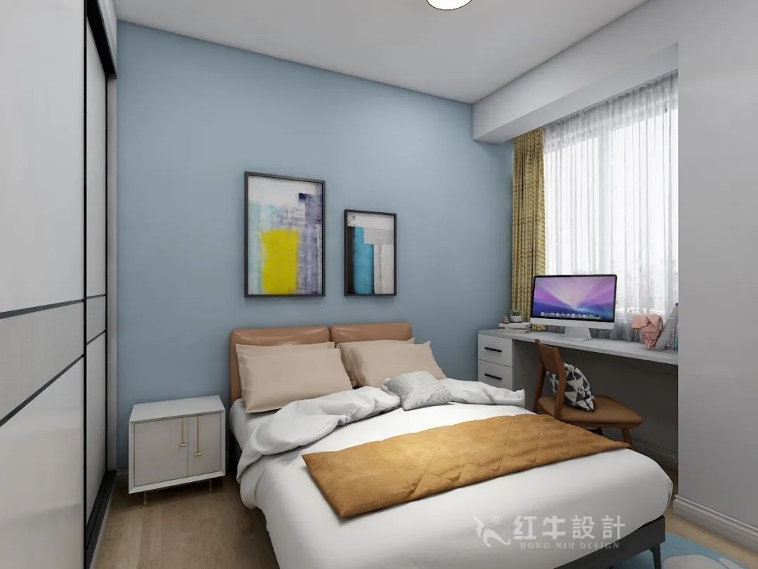 次臥室是孩子房間,床頭選用藍(lán)色墻紙,配橙色皮床,窗簾是黃色條紋款,活潑有朝氣。