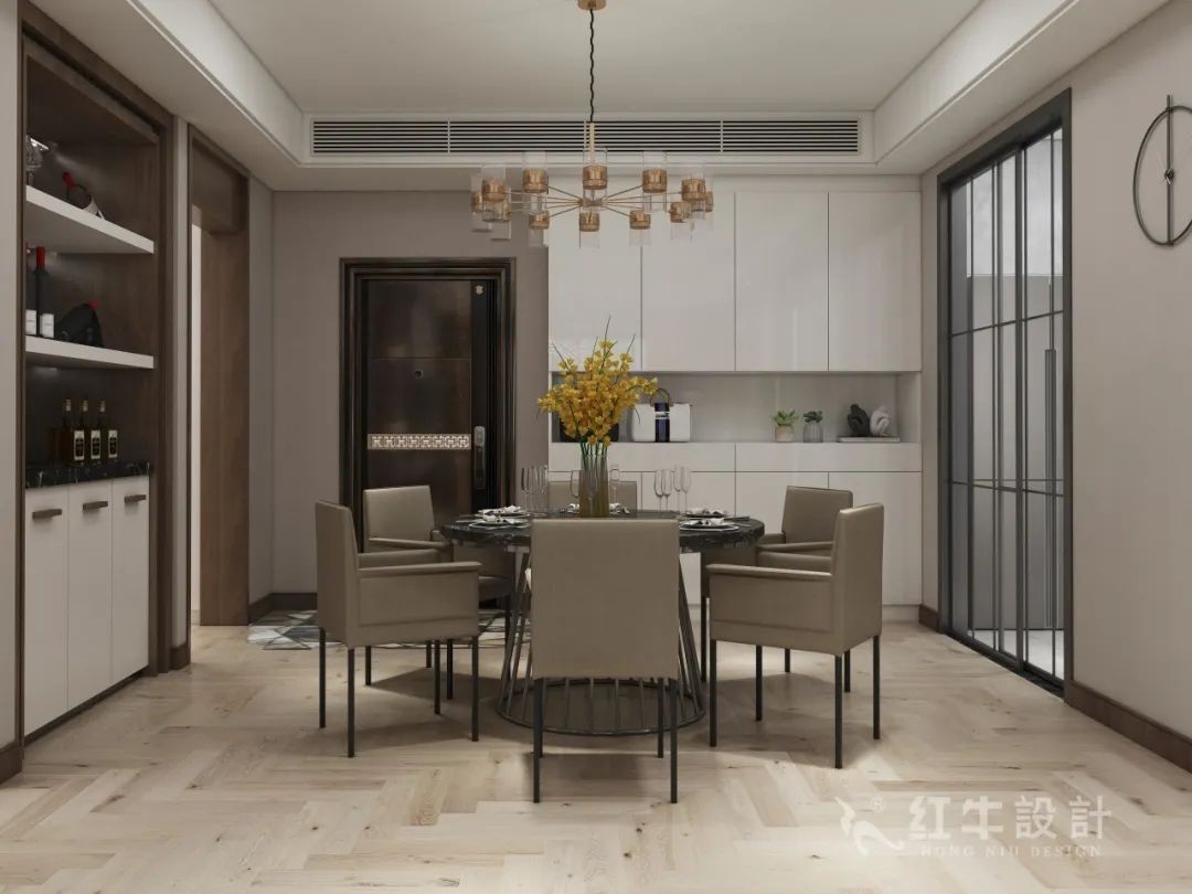 餐廳增加了一組酒柜,使得空間更有層次,凸顯出業(yè)主的生活品味。