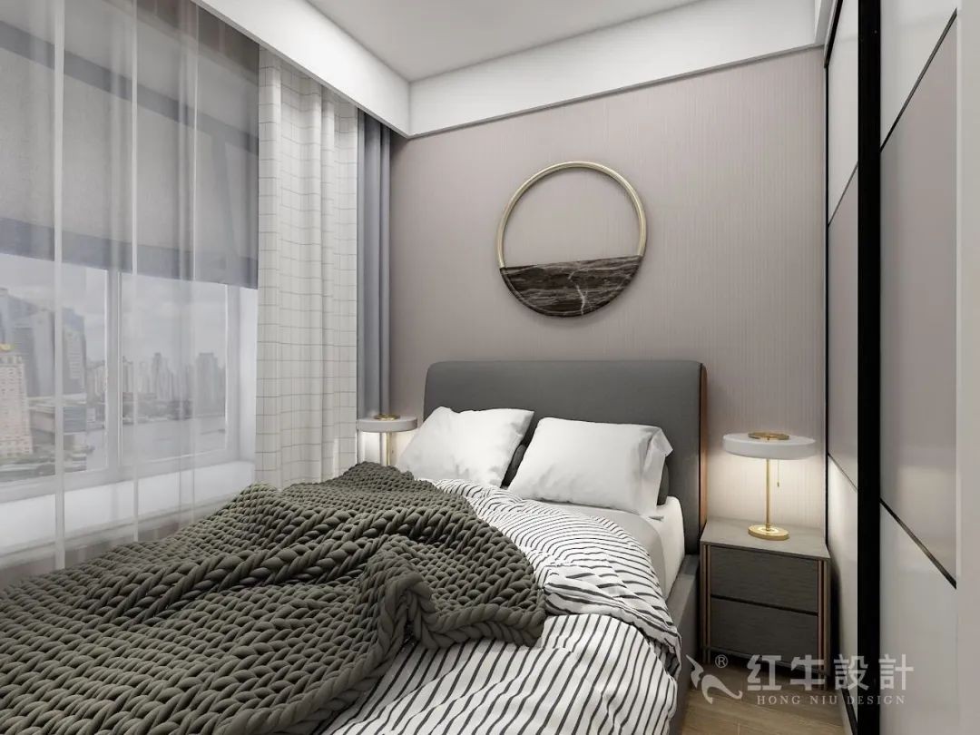 淺灰色很好地表達(dá)出臥室的清新舒適,圓形裝飾畫起到了很好的裝飾與點(diǎn)綴的作用,精致的臺(tái)燈增加了空間美感。