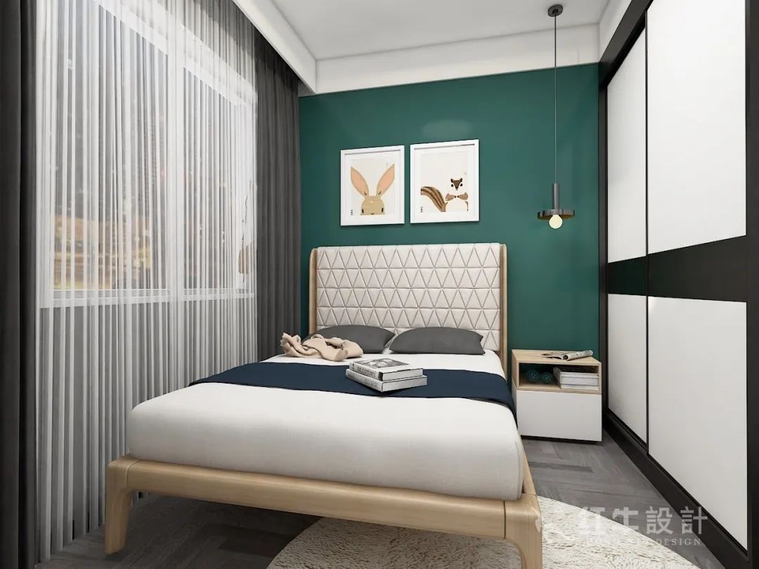 整面的藍(lán)綠色的背景墻清新又養(yǎng)眼,沒(méi)有深色的壓抑,又比白色活潑,給空間帶來(lái)了耳目一新的感受。