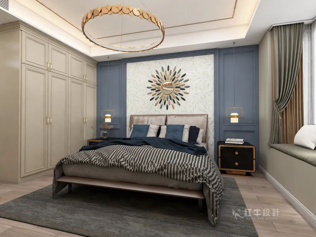 主臥背景墻采用藍(lán)色護(hù)墻板,給人一種深邃、理智的感覺。搭配清新淡雅的墻布,讓空間氛圍顯得柔和。床頭柜兩邊銅色的吊燈,則帶來了一絲時(shí)尚氣息。
