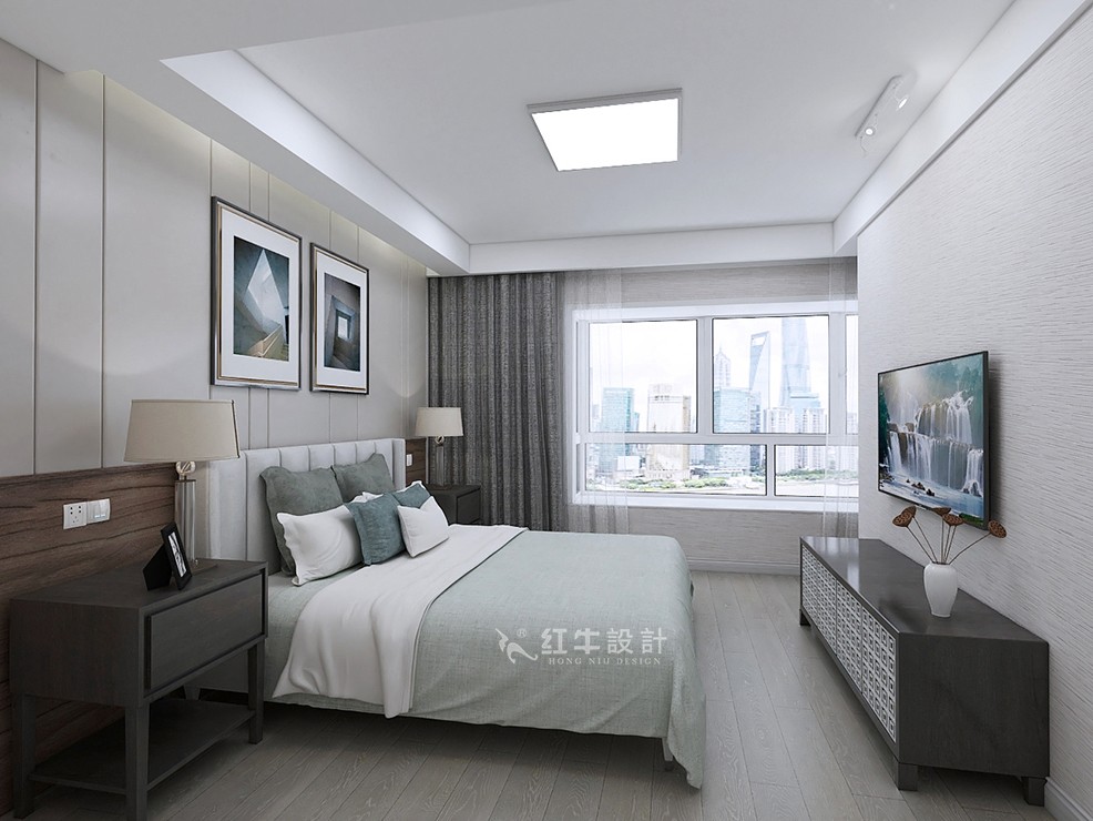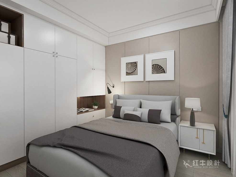主臥室光線充足,180度全景大飄窗,衣帽間的設(shè)計(jì),不單要滿足客戶的儲藏空間,還要有梳妝臺的功能。其它整體空間基本合理,以通透性、實(shí)用性、舒適性為主要設(shè)計(jì)思路。客戶喜歡現(xiàn)代風(fēng)格,但是不喜歡太單調(diào)的東西,定位后現(xiàn)代的風(fēng)格,客廳背景有一個(gè)到次臥室的門,設(shè)計(jì)成了隱形門,電視背景墻形成了一個(gè)整體,兩邊是框架線條加上硬包,中間鑲嵌銅條,節(jié)約大氣。