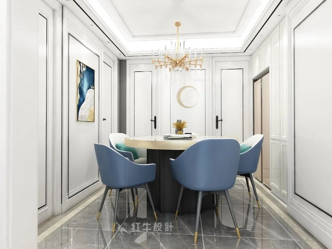 白色大理石的餐桌搭配藍(lán)色的椅子,經(jīng)過精致的布局,顯得優(yōu)雅浪漫。