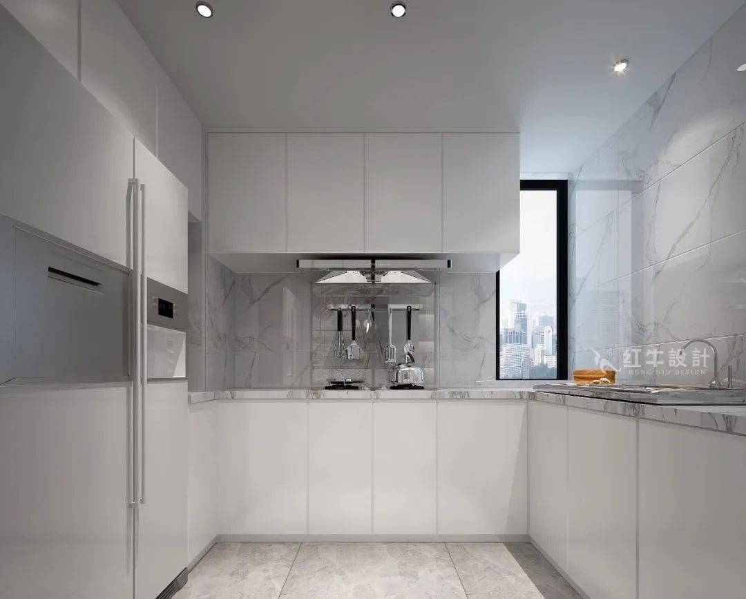 白色給人一種純凈通透的感覺,讓廚房空間顯得寬敞通透不少。此外,廚房靠近餐廳,出菜也很方便。