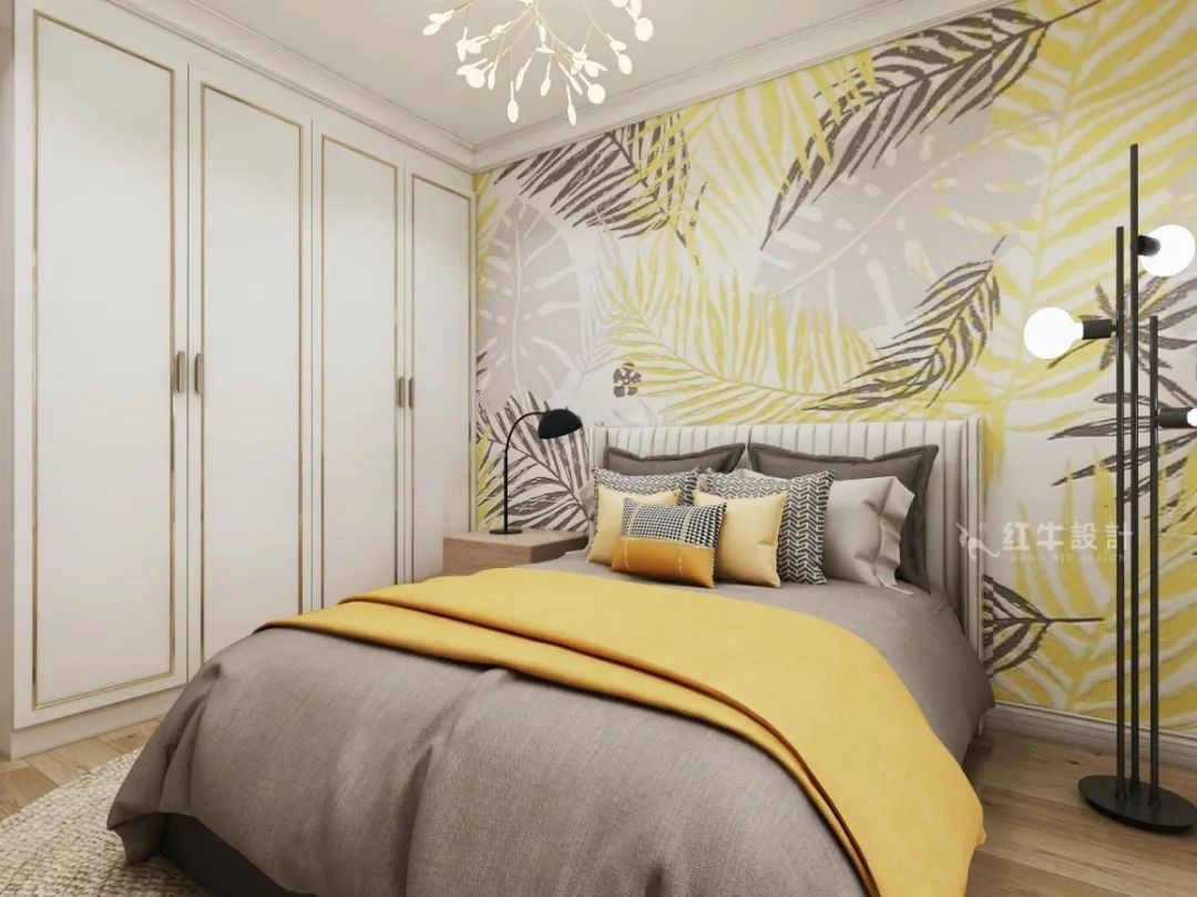 白色衣柜加上金色的線條點(diǎn)綴,非常精致美麗。造型別致的落地?zé)魸M足房間局部照明和點(diǎn)綴裝飾家庭環(huán)境的需求。背景墻上的葉子圖案洋溢著熱帶風(fēng)情,讓人感覺充滿活力。