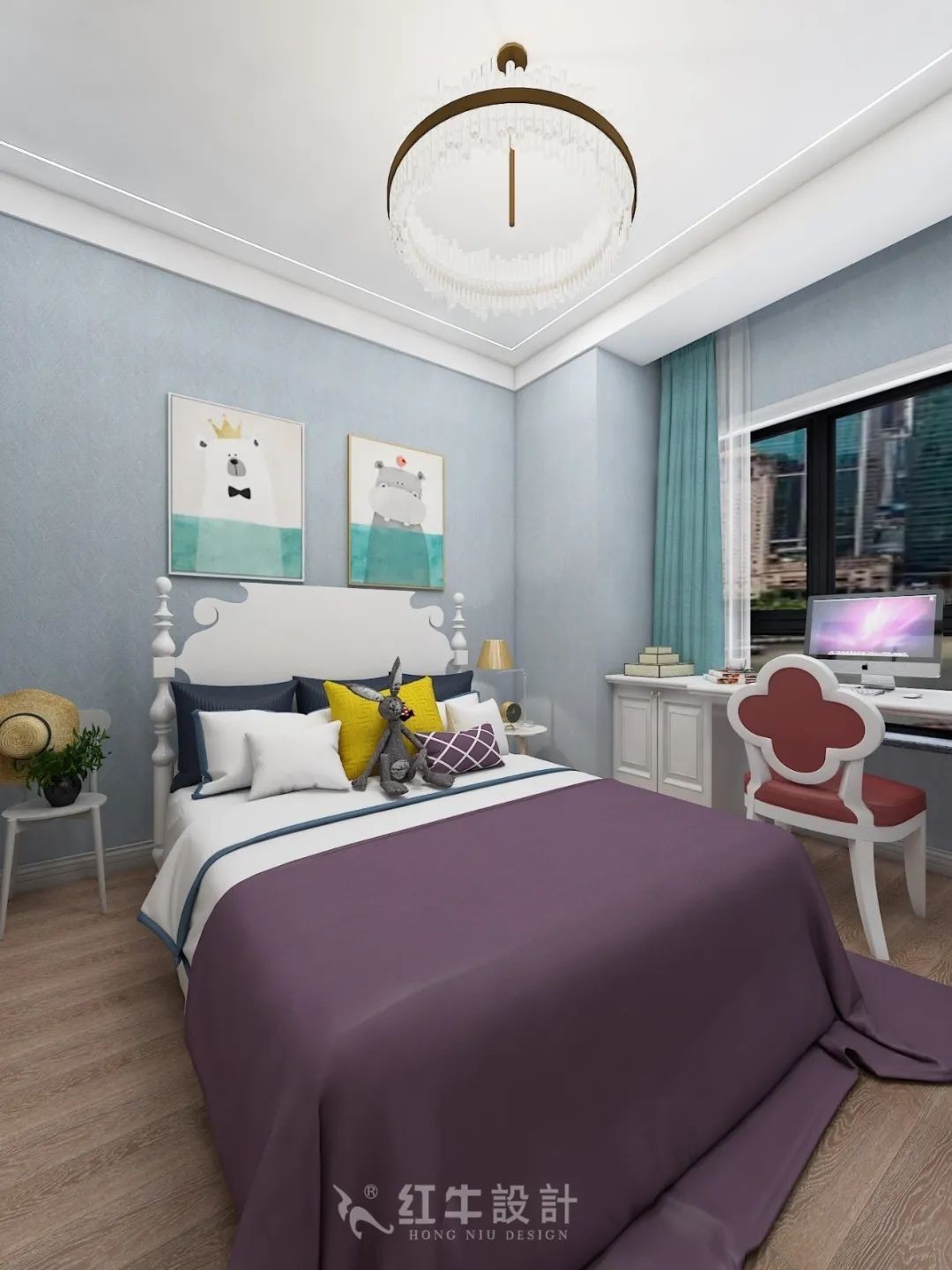 藍(lán)色的墻面營造出寧靜的氛圍。床品、裝飾畫的選擇顯得活潑有童趣。窗邊的書桌椅,為孩子提供非常充足的學(xué)習(xí)空間。