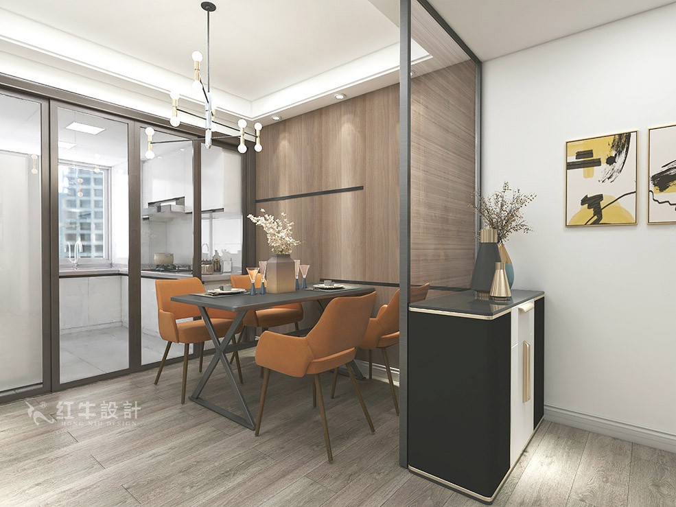 本案現(xiàn)代簡約風格,進門玄關即美觀又起門廳作用,利用北陽臺空間做出廚房,客廳和餐廳獨自的空間,簡約的電視背景和餐廳背景設計,通過軟裝色彩的搭配,讓空間更加溫馨。