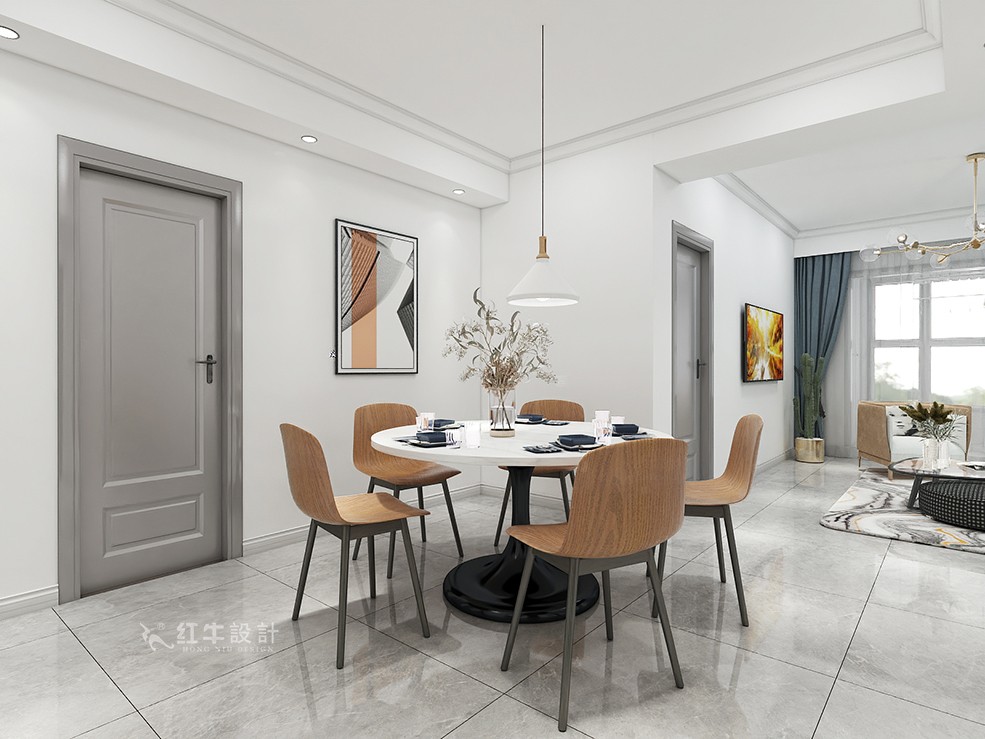 圓形餐桌互動(dòng)性很強(qiáng),家人圍桌而坐,顯得更加親密。客餐廳選擇的灰色瓷磚,無論是耐磨還是易清潔方面,都符合大多數(shù)業(yè)主的追求。
