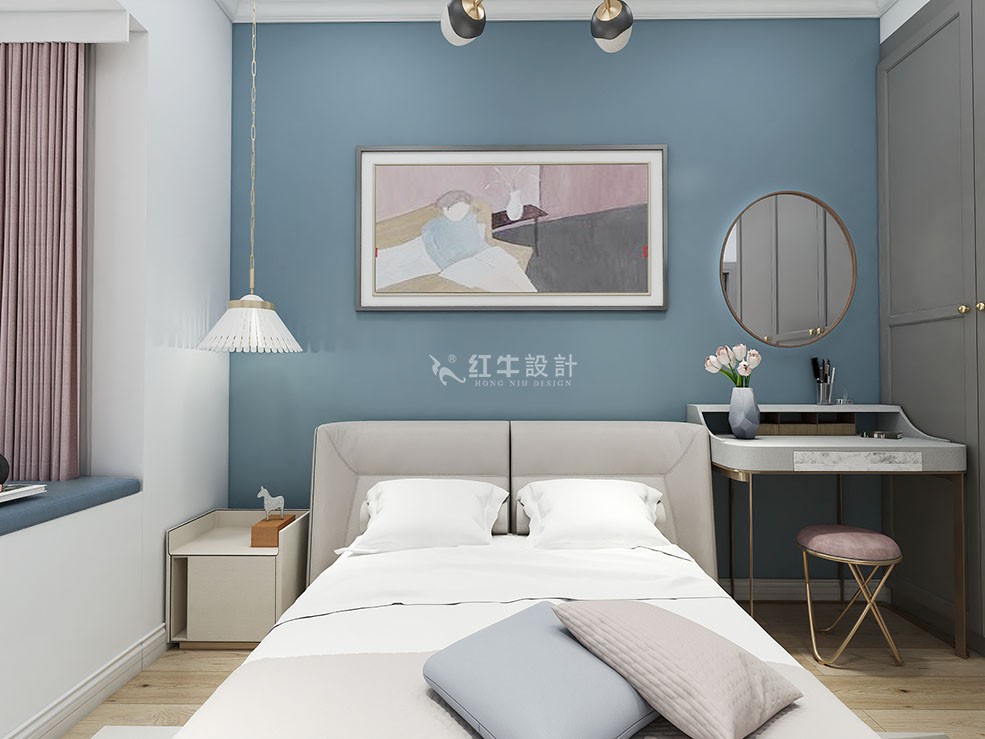 本案以輕松愉悅的北歐風(fēng)設(shè)計(jì)感與溫馨家的氛圍為出發(fā)點(diǎn),公共區(qū)域客廳用霧霾藍(lán)背景墻,與其他區(qū)域形成鮮明對比,著重空間視覺重點(diǎn)。私密區(qū)域,次臥增加梳妝臺(tái),床頭一側(cè)的小吊燈,不對稱的設(shè)計(jì),不拘一格。兒童房榻榻米,與淡黃色的乳膠漆,顯得空間童趣又具有足夠的儲(chǔ)藏空間。整體營造北歐風(fēng)與溫馨家的氛圍。