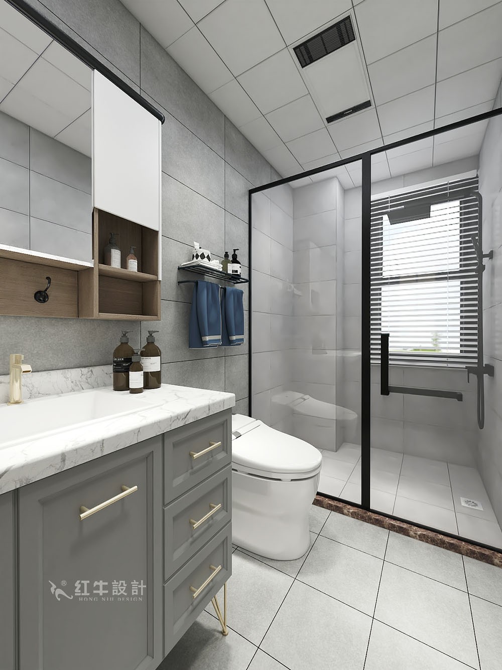 洗手臺(tái)沒有到底,能夠減少水汽對它的腐蝕,此外還方便打掃。入墻式馬桶非常簡潔,顏值頗高。鏡柜既是鏡子,又能用來收納,使得衛(wèi)生間的物品井井有條。