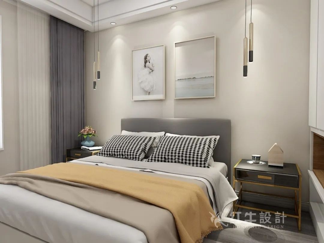 兩側(cè)的床頭吊燈充分體現(xiàn)的了時(shí)尚感,同時(shí)也讓床頭柜的空間釋放出來。