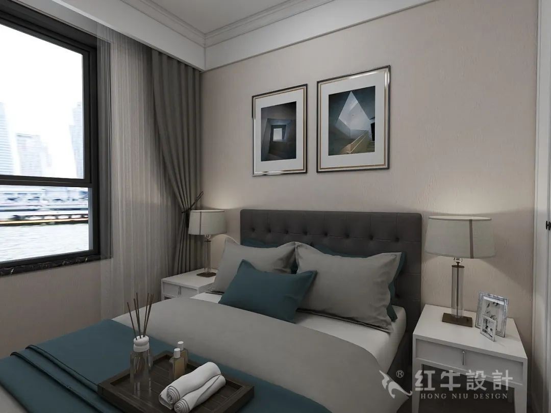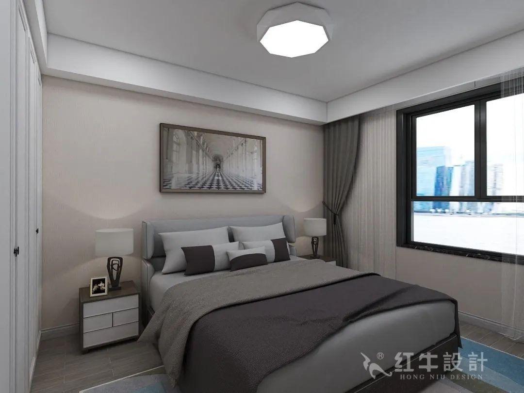 對稱設(shè)計(jì)的主臥寬敞舒適,床邊鋪上了厚厚的地毯,下床時(shí)就不會冰腳了。