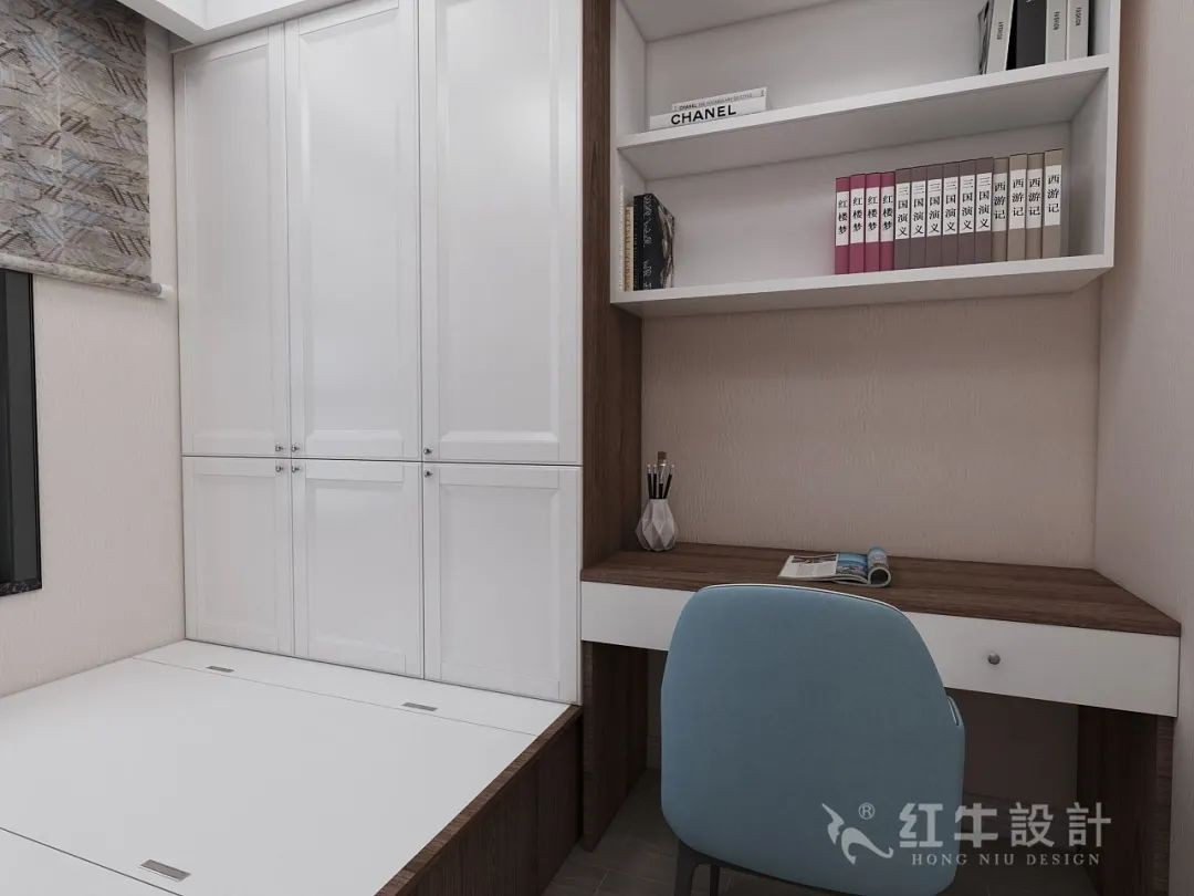 對主衛(wèi)門的開啟方向進(jìn)行調(diào)整,解決了主臥風(fēng)水上的弊端。然后在原先的開門位置設(shè)計(jì)了衣柜,增加了空間儲物能力。
