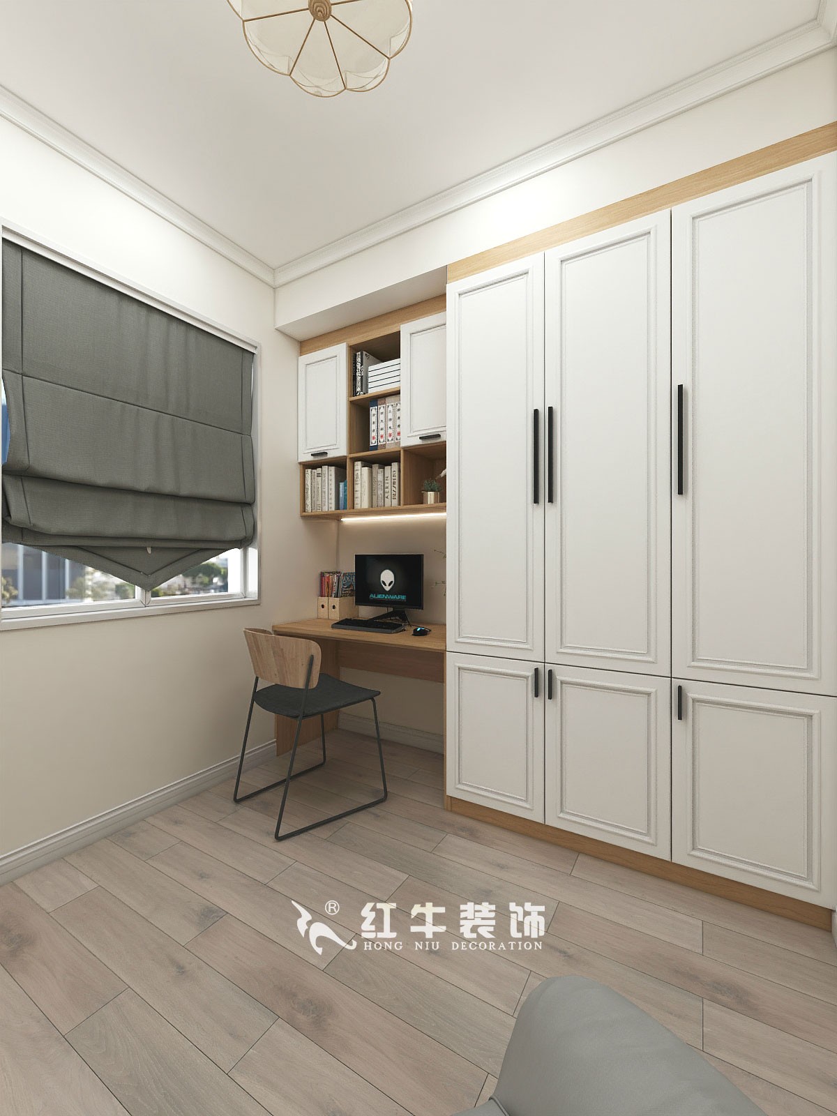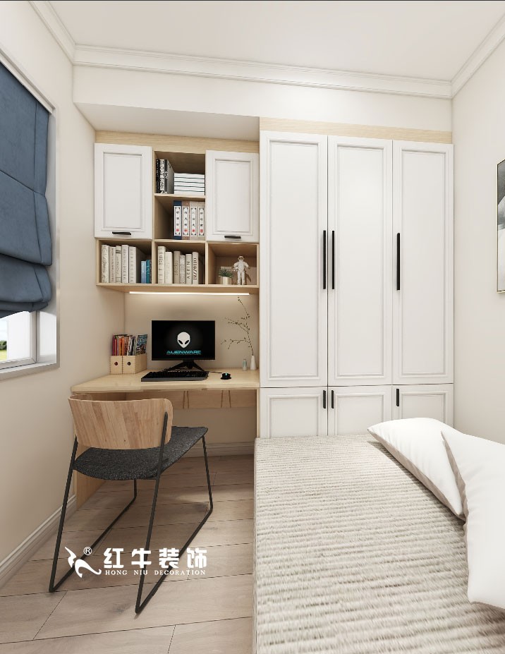 飄窗是卡座的樣式,午后靠著腰枕在上面休息會(huì)非常愜意。下面一排柜子為臥室提供了非常充足的儲(chǔ)物空間。