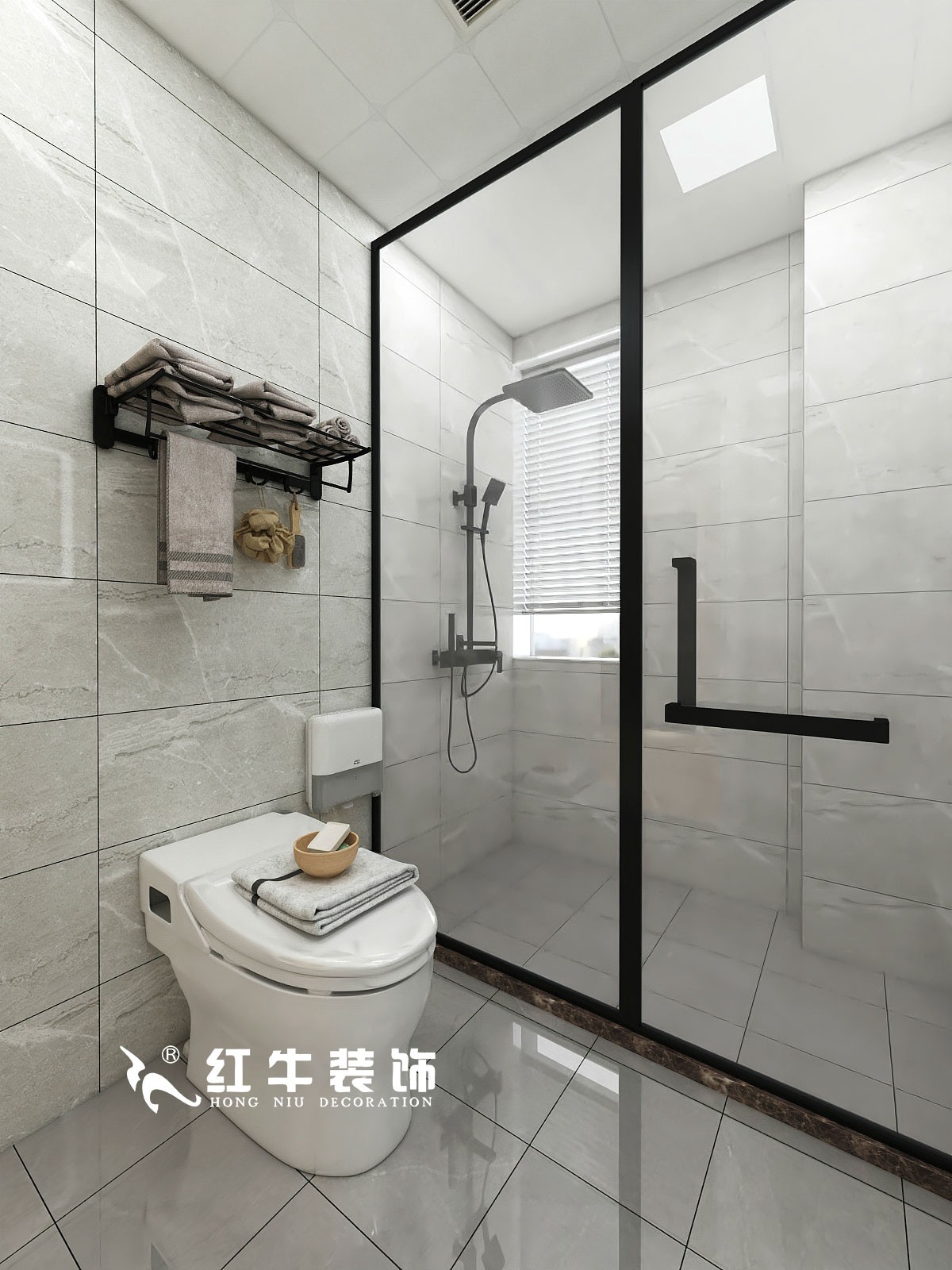黑色邊框淋浴房加黑色的五金件,與墻地面形成對(duì)比,整體比較耐看。同樣材質(zhì)的置物架很好地利用了馬桶上方的位置,平時(shí)可以用來(lái)放置浴巾、懸掛毛巾。