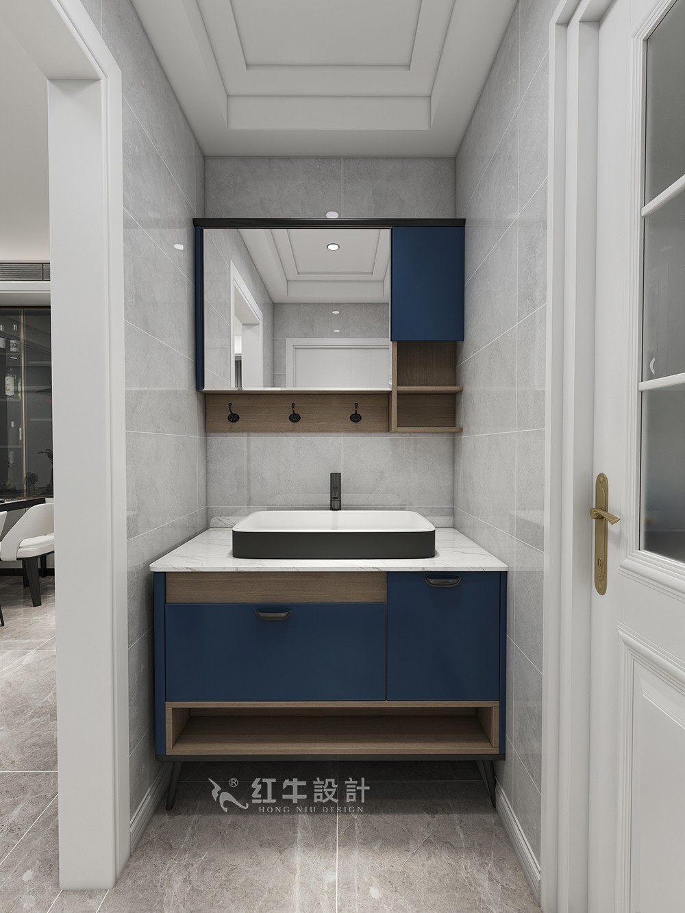 因為只有一個衛(wèi)生間,所以將洗手臺外移,洗手和如廁互不干擾,在早晚高峰時期能夠提高使用效率。