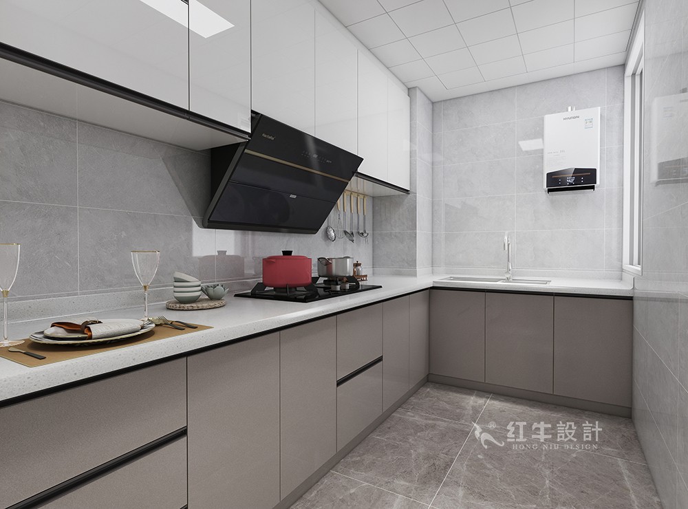 L型櫥柜非常適合本案狹長型的廚房,將洗菜和烹飪區(qū)分開,各司其職,真正做到洗菜做飯兩不誤。