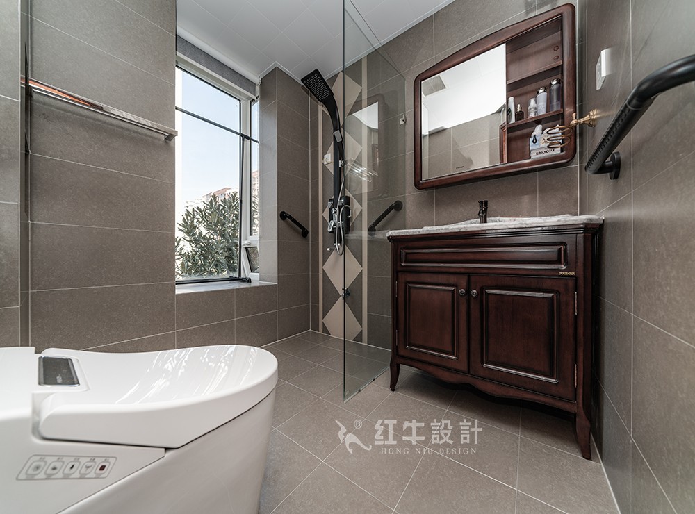 主臥的淋浴部分選擇了半隔斷設(shè)計(jì),只要遮擋住花灑,保留一平米的遮擋位置,同樣能阻擋水漬外濺,這樣的設(shè)計(jì)簡(jiǎn)潔大方,使得衛(wèi)生間看起來更寬敞通透。