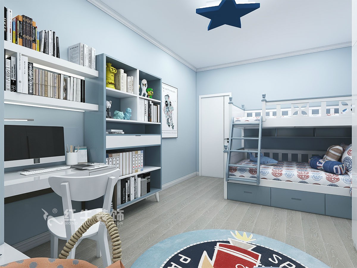 小男生的居住空間需開放活波,上下床搭配全屋定制衣柜和書桌,后期都可根據(jù)自己的喜好來改善和配置,在此空間內(nèi)采用了調(diào)色的處理,淡藍色的背景較安逸。