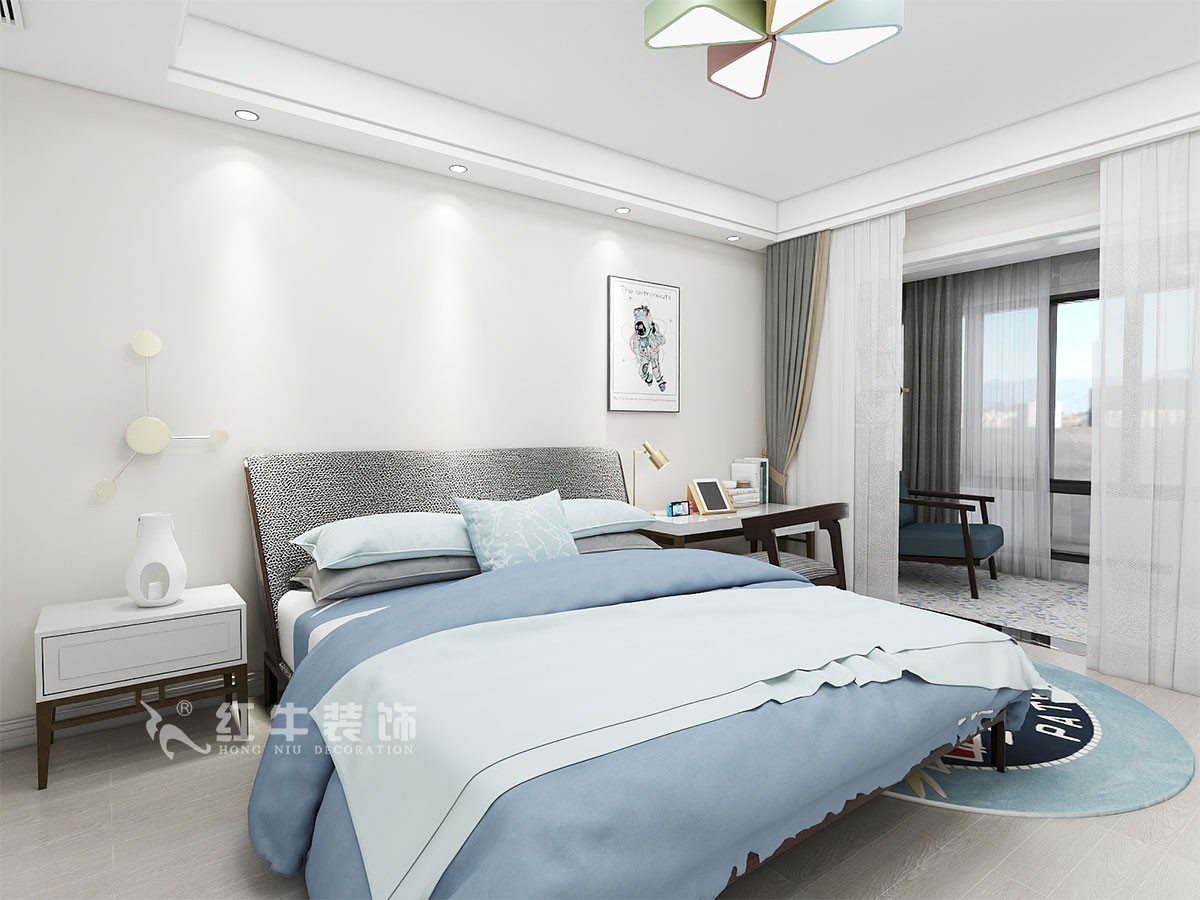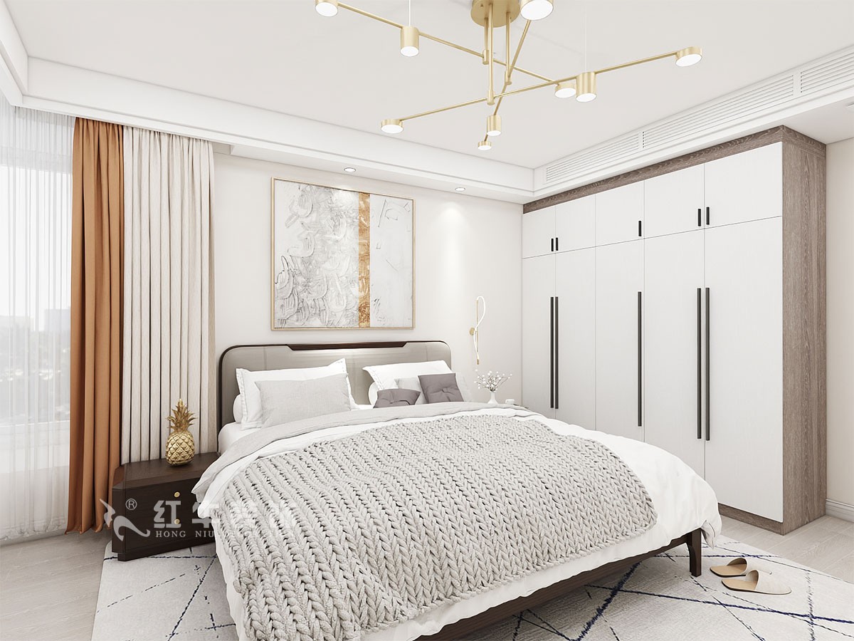 臥室內(nèi)采用大面調(diào)色的處理,以暖色調(diào)為主,居住空間也不顯冷意。軟裝搭配方面也進(jìn)行功能間的區(qū)分,滿足美感也較實(shí)用。
