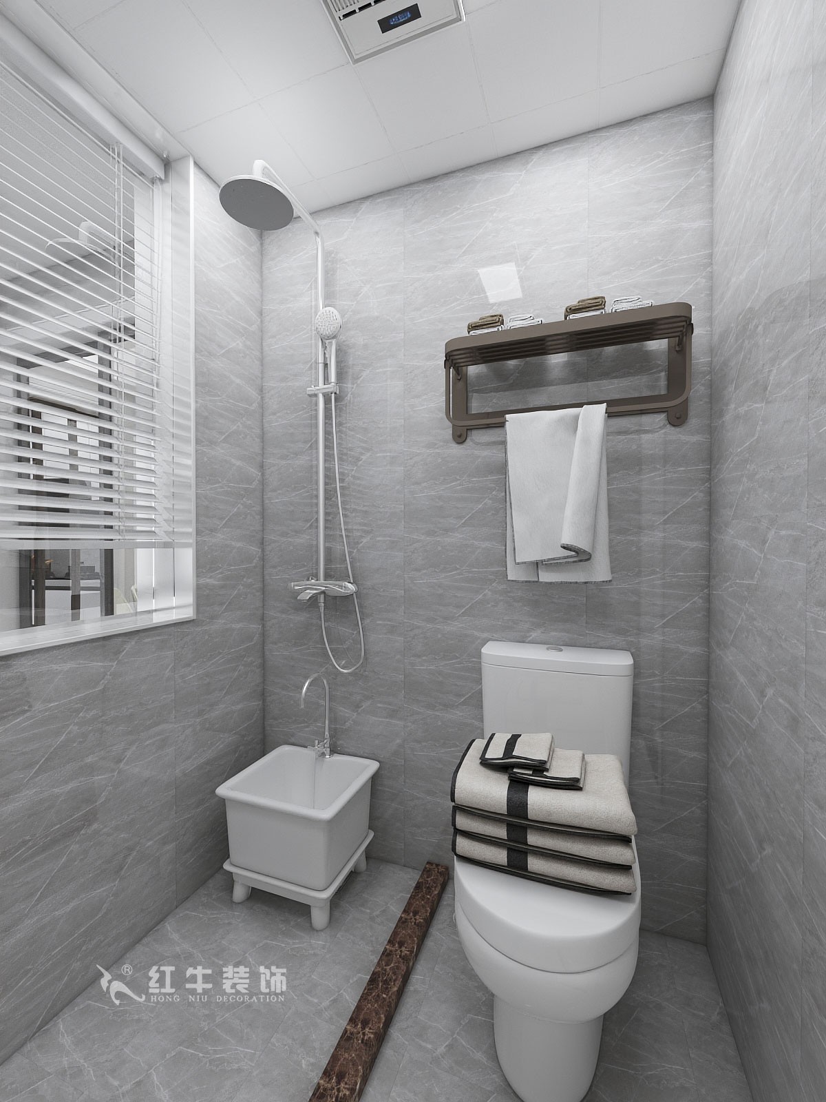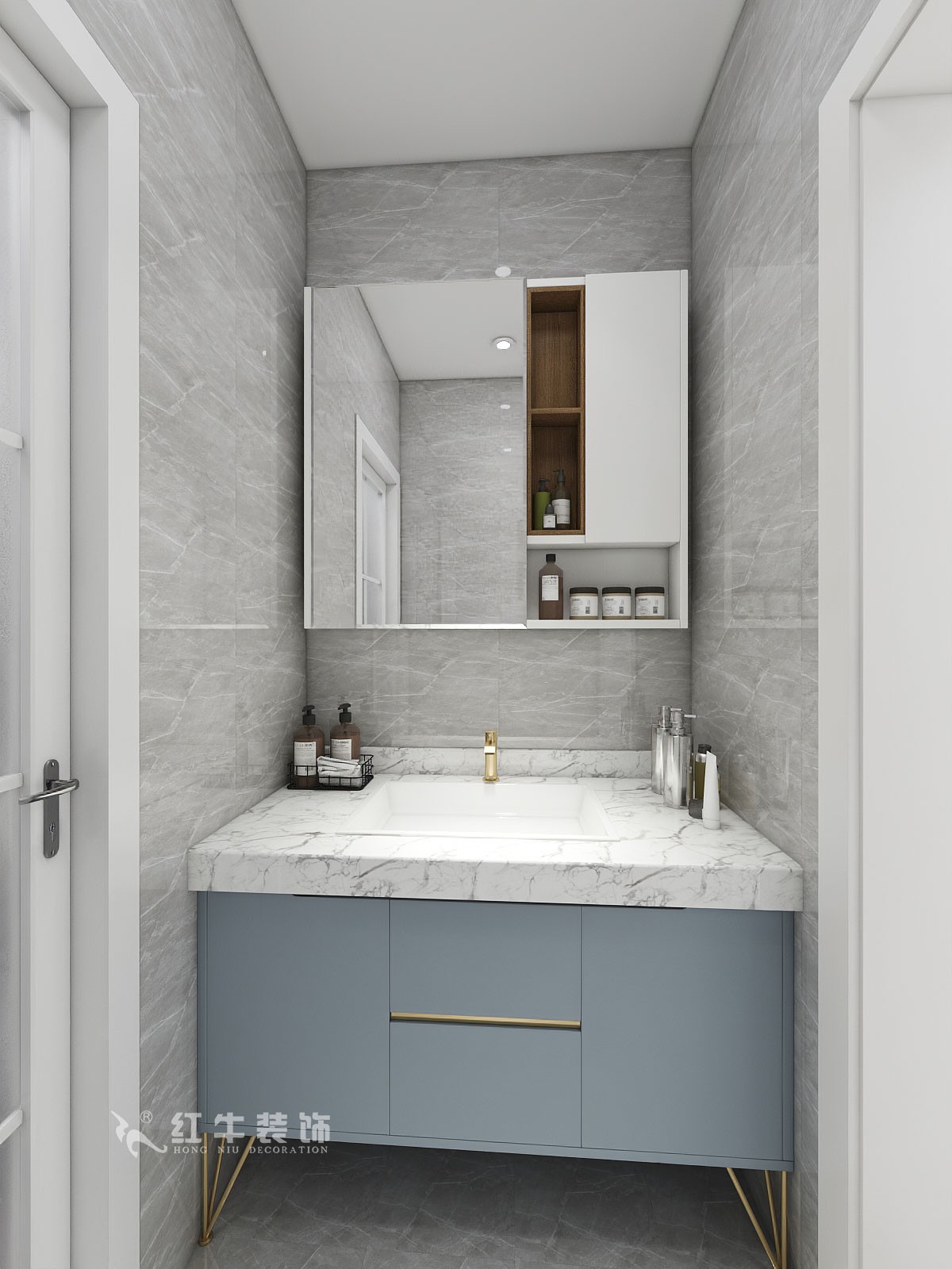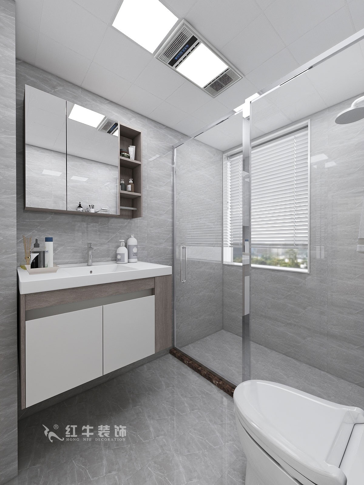 保留兩個(gè)衛(wèi)生間,滿足了使用,在磚色選擇上以灰調(diào)為主,視覺(jué)感官上拉升了空間,花磚的點(diǎn)綴也增添些許情調(diào)。