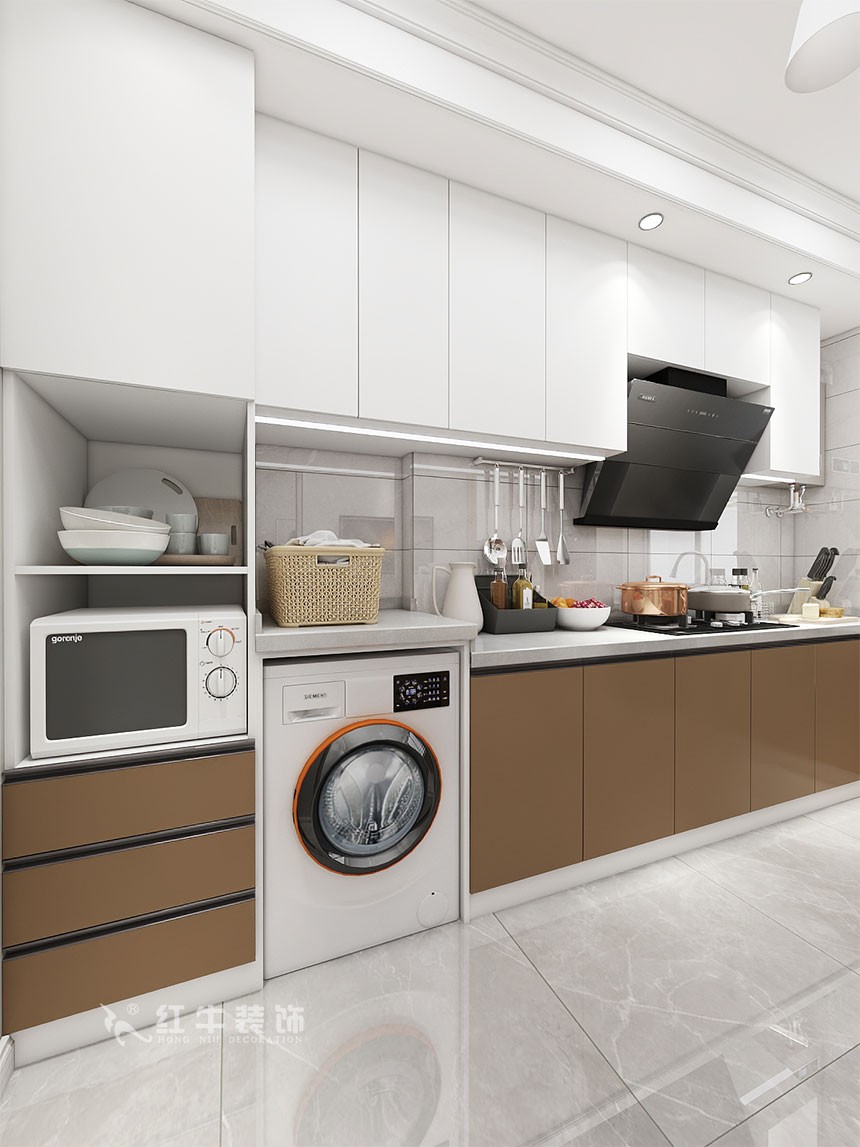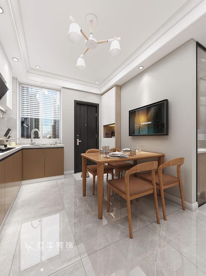 本案設(shè)計墻面用的是高級灰,家具柜體以木色為主,配上白色的門板,讓空間更加溫馨,吊頂層高做高點,燈光設(shè)計講究空間的柔和,著重點光源的點綴,讓家更加的明亮溫馨。