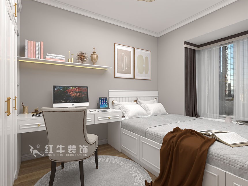 整體風(fēng)格簡約,白色和木紋色營造出溫馨的生活氣息,次臥室設(shè)計(jì)了組合柜,既有學(xué)習(xí)的區(qū)域同時(shí)也兼顧了休閑空間。
