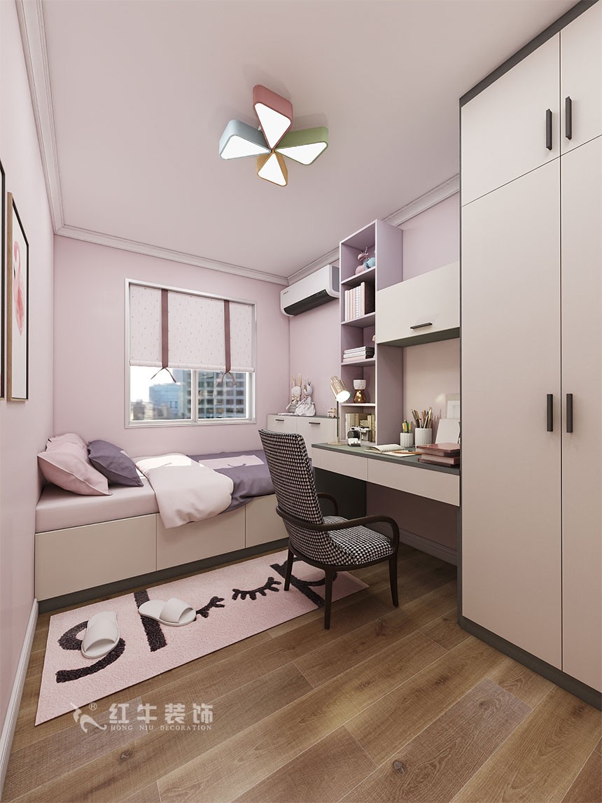 整體風格簡約,白色和木紋色營造出溫馨的生活氣息,次臥室設計了組合柜,既有學習的區(qū)域同時也兼顧了休閑空間。
