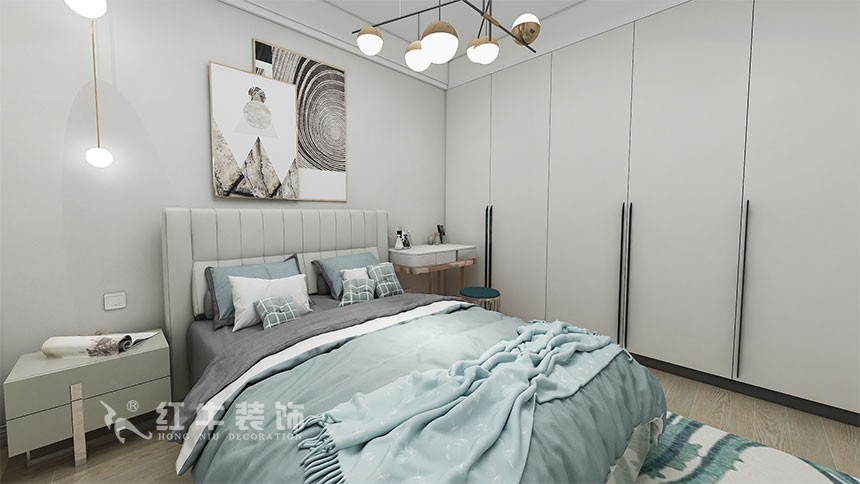 整體風(fēng)格簡(jiǎn)約,白色和淺灰色營(yíng)造出溫馨的生活氣息,次臥室設(shè)計(jì)了組合柜,既有學(xué)習(xí)的區(qū)域同時(shí)也兼顧了休閑空間。