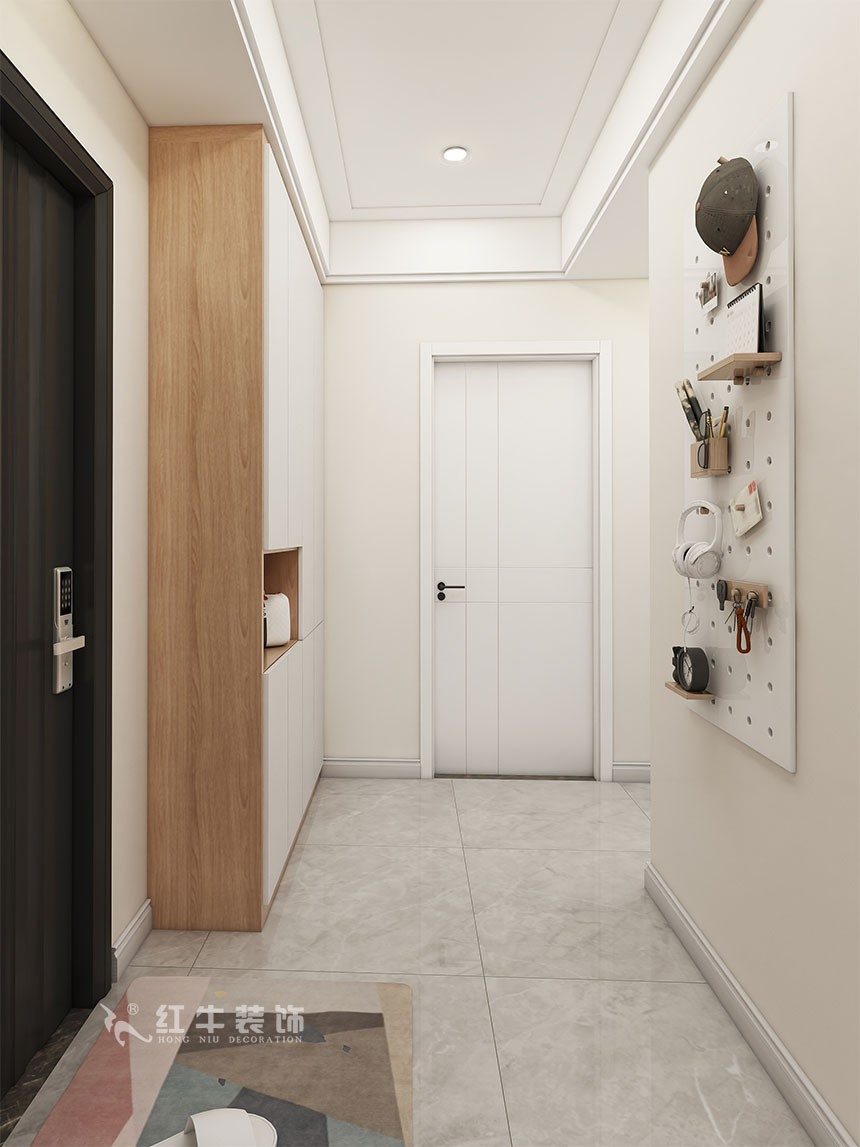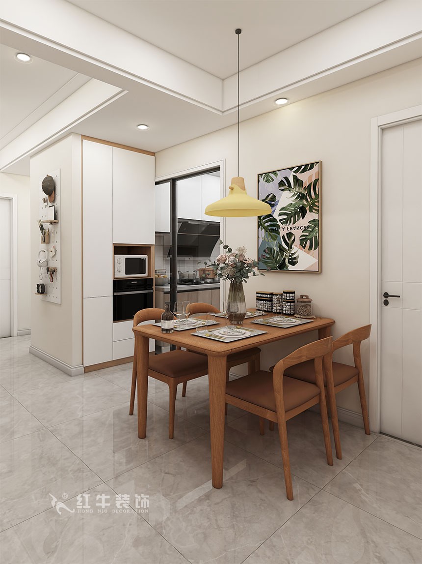 本案設(shè)計墻面用的是白色乳膠漆,家具柜體以木色為主,配上白色的門板,讓空間更加溫馨,吊頂層高做高點(diǎn),燈光設(shè)計講究空間的柔和,著重點(diǎn)光源的點(diǎn)綴,讓家更加的明亮溫馨。