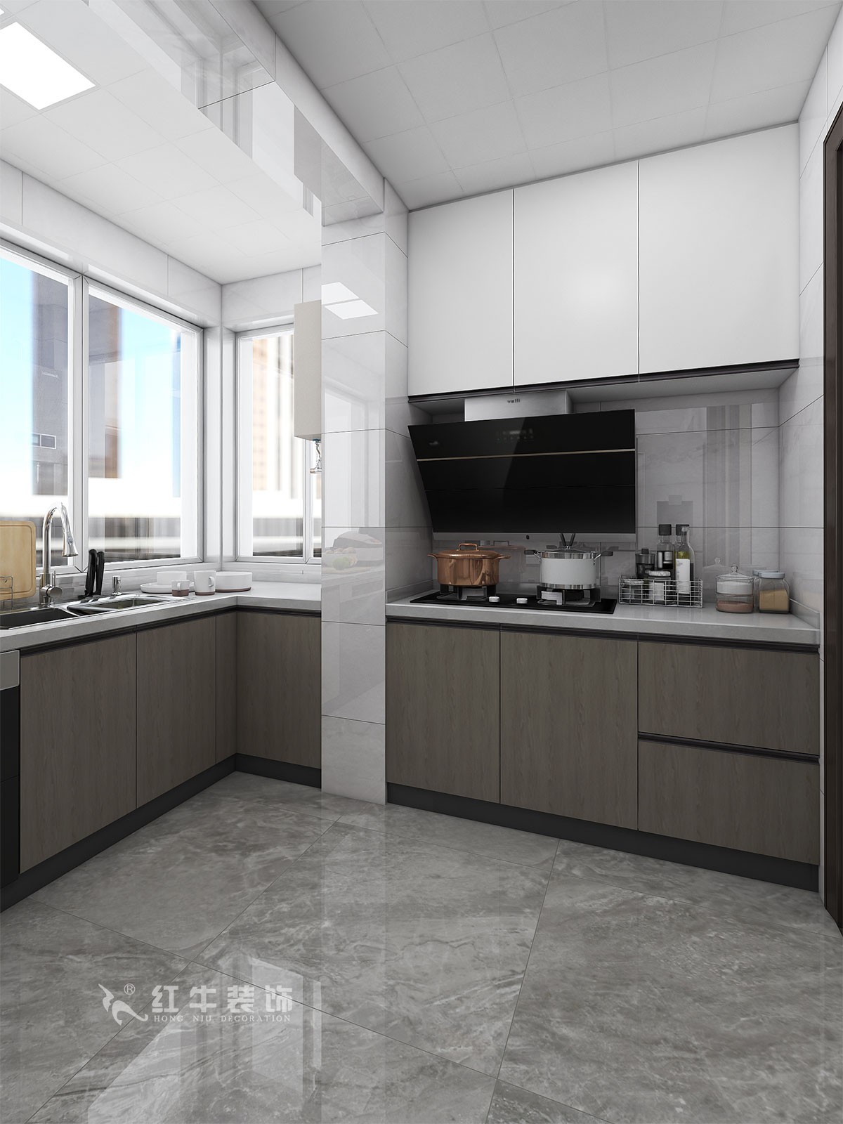 客廳北陽臺打通并入廚房,增加廚房內(nèi)部電器空間,層次更分明,提升了整體效果。