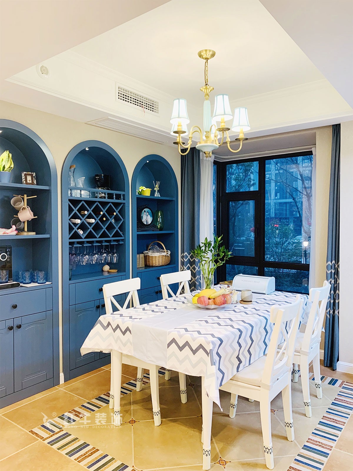 以白色為主色調(diào)的餐廳,顯得尤為純凈雅致,最吸睛的就是藍(lán)色的內(nèi)嵌的置物架,頂部的拱形設(shè)計(jì)就是地中海風(fēng)格的典型特征。