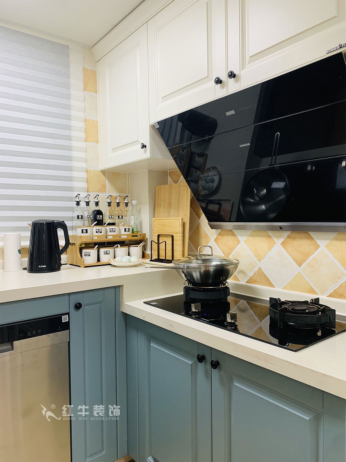 櫥柜柜門的顏色決定了整個(gè)廚房的色調(diào),給燥熱的廚房空間帶來一絲清涼。