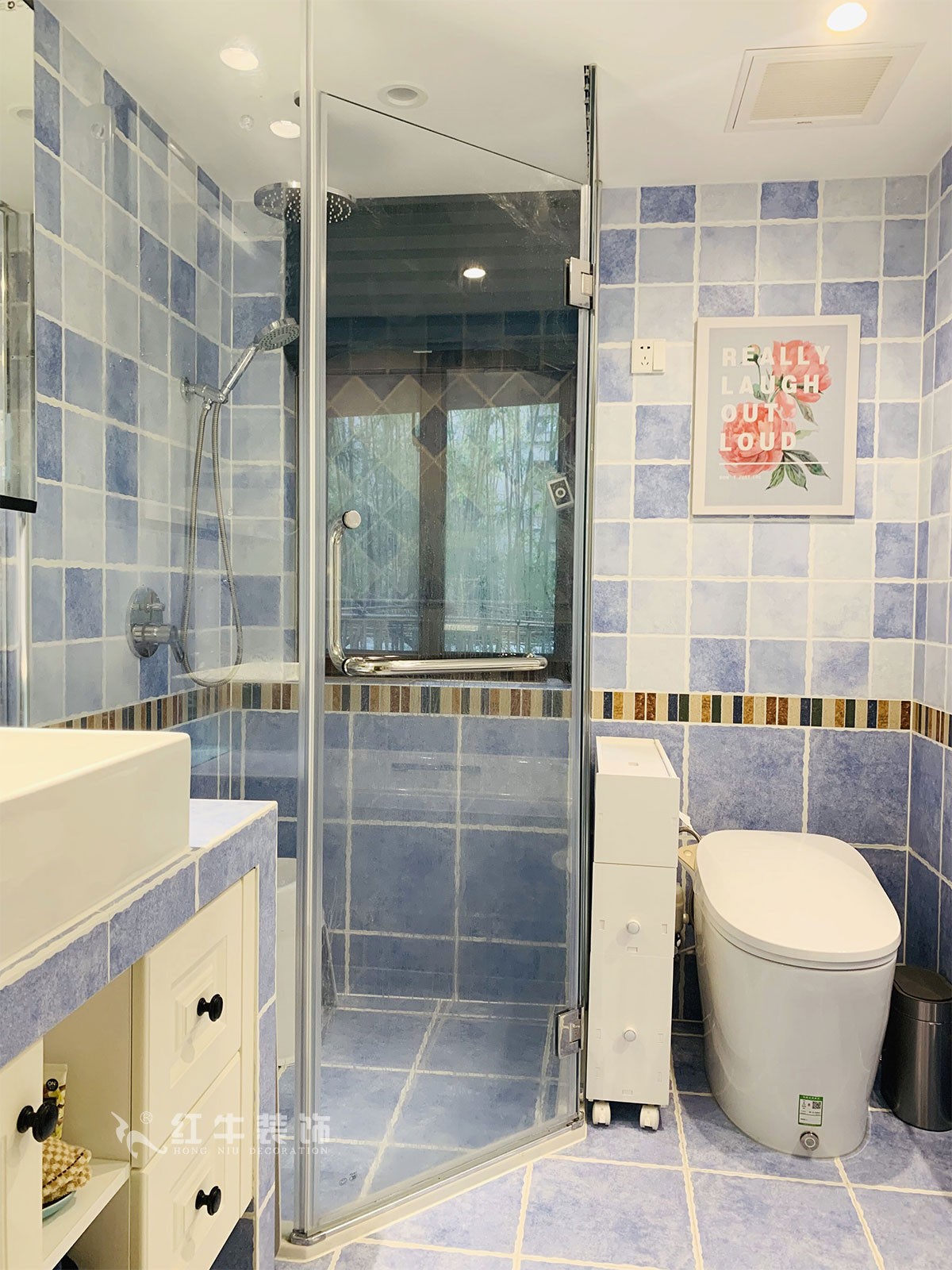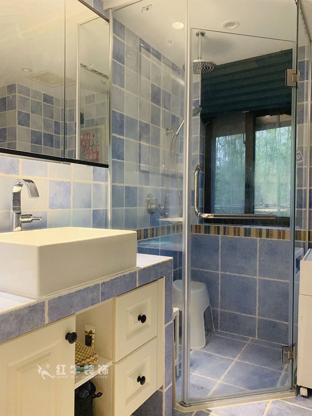 這是主臥的衛(wèi)生間,不同的藍(lán)色、白色瓷磚拼貼在一起,在井然有序中又體現(xiàn)出生動(dòng)和變化,看著感覺心情舒暢。