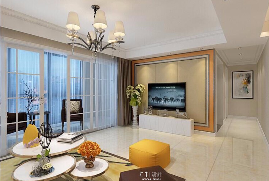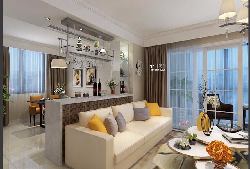 此案設(shè)計(jì)運(yùn)用了石材、不銹鋼、硬包、馬賽克等材質(zhì),通過不同材質(zhì)帶來的質(zhì)感體現(xiàn)人們對生活的態(tài)度及品質(zhì)的追求。布藝沙發(fā)、金屬包邊的茶幾、背景墻局部橙色的跳色,顯得整個俏皮但又不缺乏生活氣息的居所。