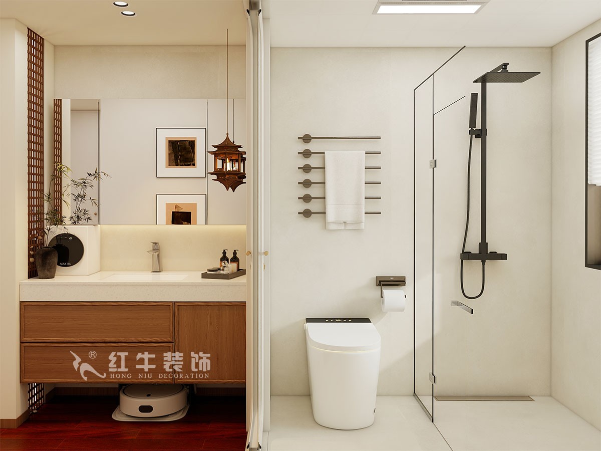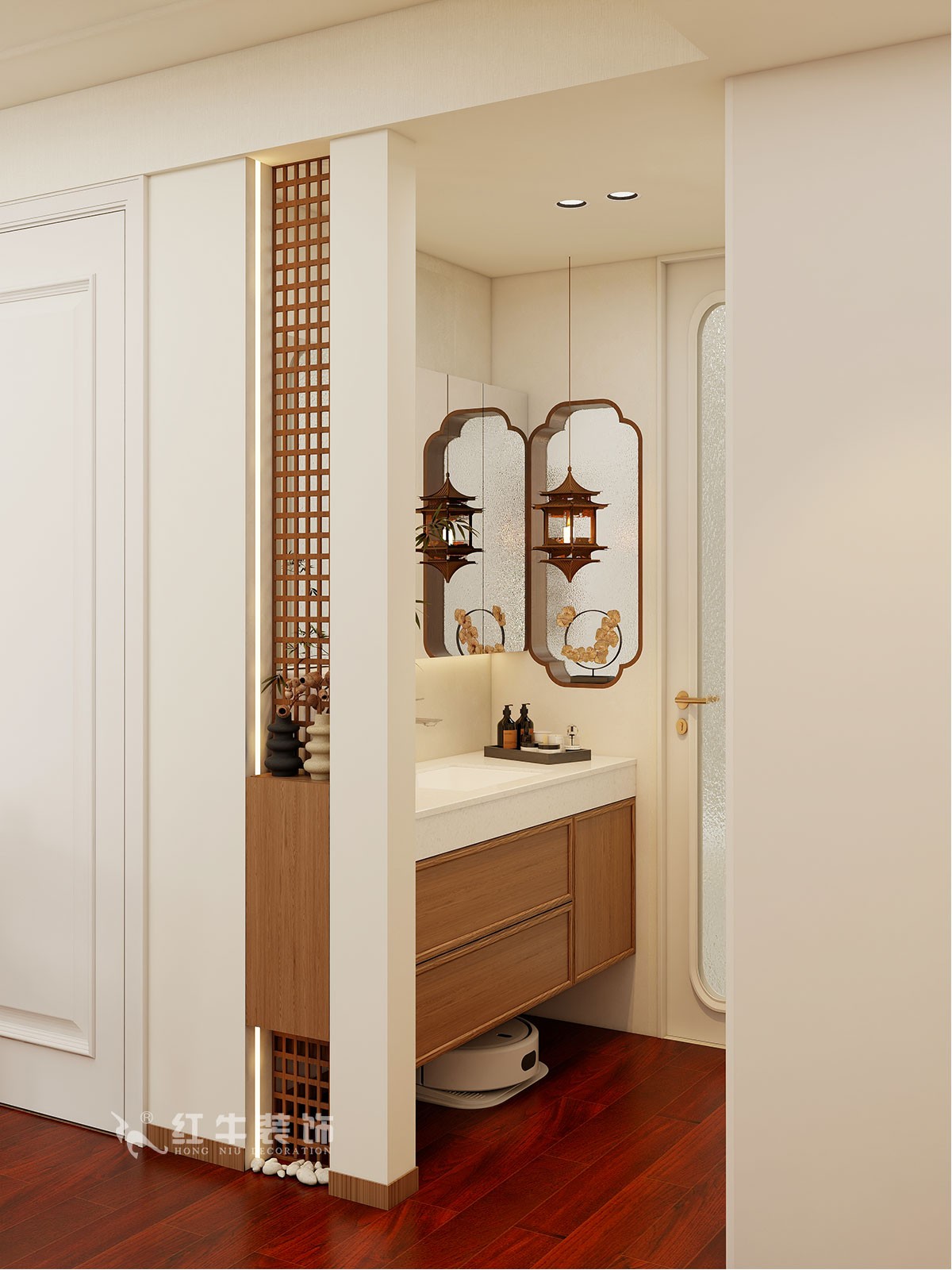 材質(zhì)運(yùn)用:全屋通鋪地板,保留自然質(zhì)感的同時提升耐用性;衛(wèi)生間采用木格柵與吊燈組合,凸顯復(fù)古趣味。