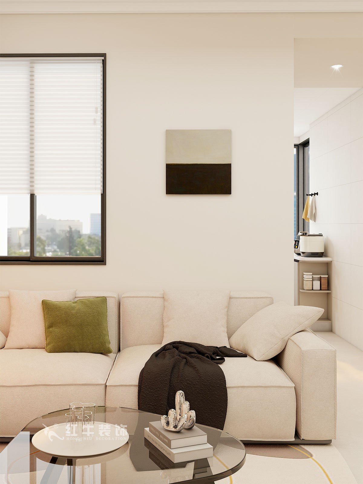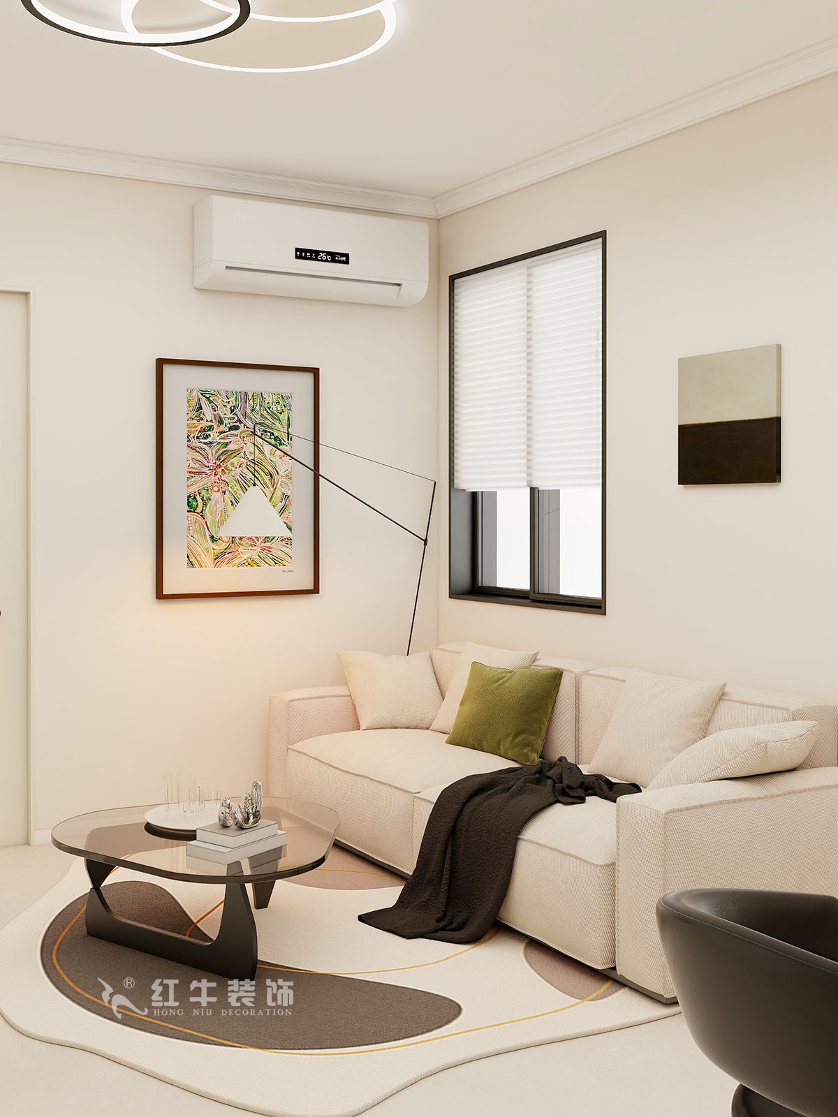 客廳說明:客廳空間墻面大面積留白,柔和的色彩,也為空間注入了時尚與溫度。